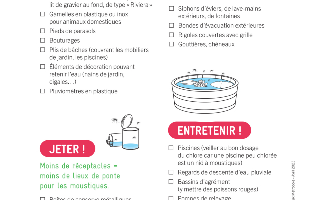 Eliminez les endroits où les larves de moustique peuvent se former : regard de descente d’eau pluviale, récupérateur d’eau, terrasse sur plots mais aussi les coupelles des pots de fleurs, arrosoirs, …
