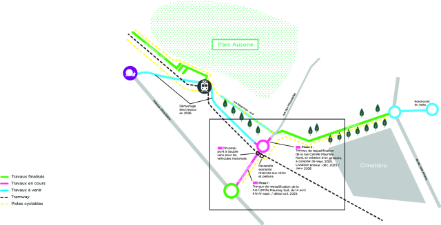 > 3e phase : 2024-2025 (pont à double sens au dessus de la voie de chemin de fer, nouvelle voie entre le pont du tram et la rue Maumey, rond point rue Ausone et avenue Jean Jaurès).