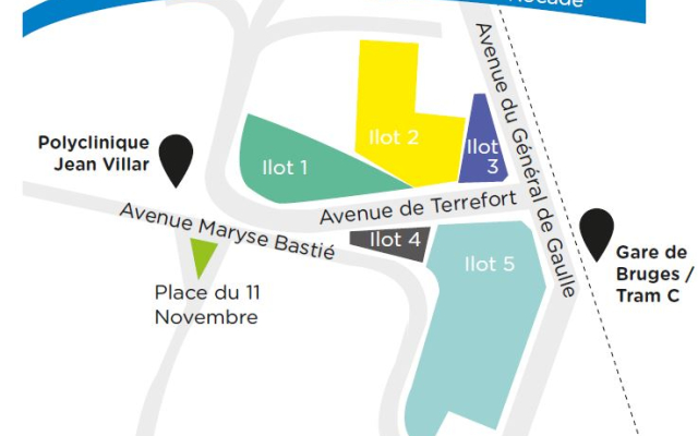 - Ilot 4 : Ce terrain accueille aujourd’hui un parking aérien en mauvais état. La ville, la Métropole et la FAB attendent de stabiliser la livraison de l’ensemble des ilots avant de déterminer sa vocation.