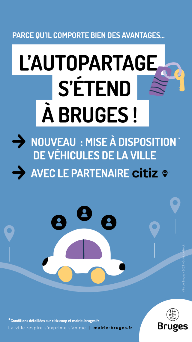 Désormais, deux véhicules de la flotte municipale qui ne sont pas utilisés le soir (18h à 8h) et le week end sont mis à disposition des Brugeais : un véhicule utilitaire (Kangoo) et une voiture citadine (C3). Ces deux véhicules seront accessibles sans clé selon un mode opératoire commun aux 200 véhicules Citiz accessibles sur Bordeaux Métropole et en Sud-Gironde ; les grands principes sont les suivants :