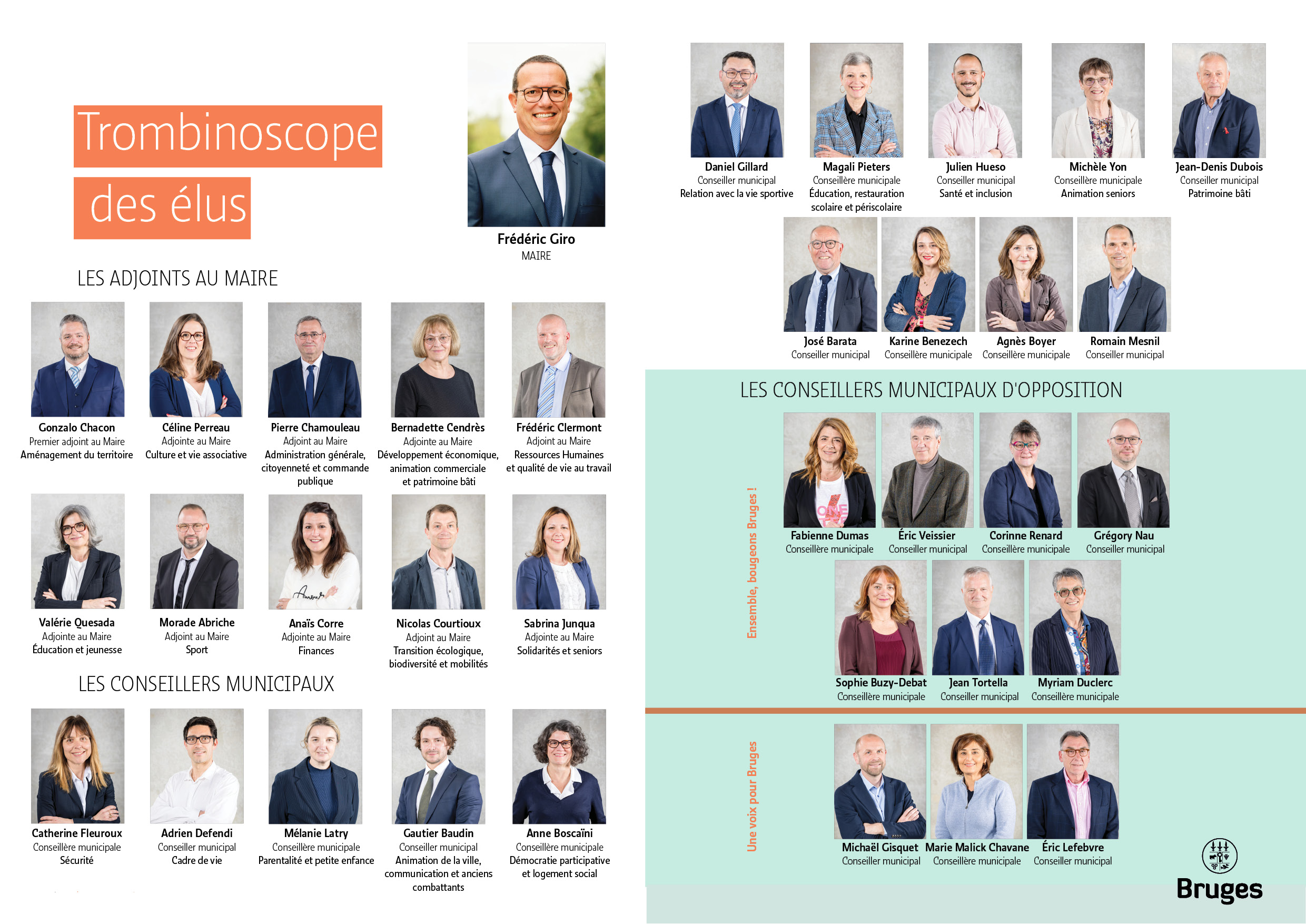 À Bruges, le Conseil municipal compte 35 membres élus pour 6 ans et se réunit au moins une fois par trimestre en séance publique. Le Maire, élu par les membres du Conseil municipal, est le représentant exécutif de la commune ainsi que le chef de l’administration. Il exerce ses pouvoirs sous le contrôle du Conseil municipal.