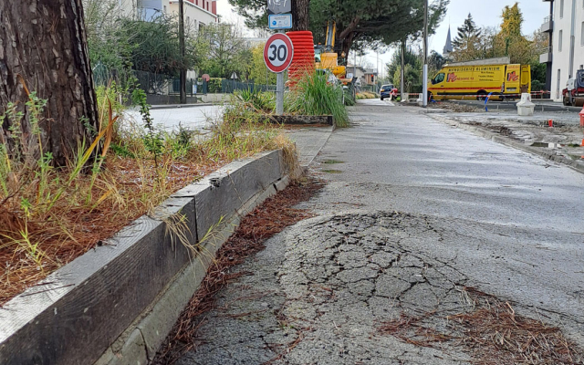 Les pins existants sur l’avenue Charles de Gaulle, près du quartier Terrefort posent actuellement des problèmes de sécurité par la présence d’un réseau racinaire provoquant des gros soulèvements des enrobés de la voirie et de la piste cyclable. L’objectif du projet est justement de faciliter et développer l’utilisation des modes doux de déplacements, tel que le vélo et de sécuriser les flux automobiles. Aussi, il est nécessaire d’adapter les types et les localisations des plantations d’arbres. 18 nouveaux arbres plus adaptés et d’essences variées remplaceront les 12 pins qui ont été retirés en lieu et place. D’autres plantations d’arbres, mais également des arbustes et vivaces, à proximité immédiate, viendront marquer une entrée de ville à dominante minérale aujourd’hui.