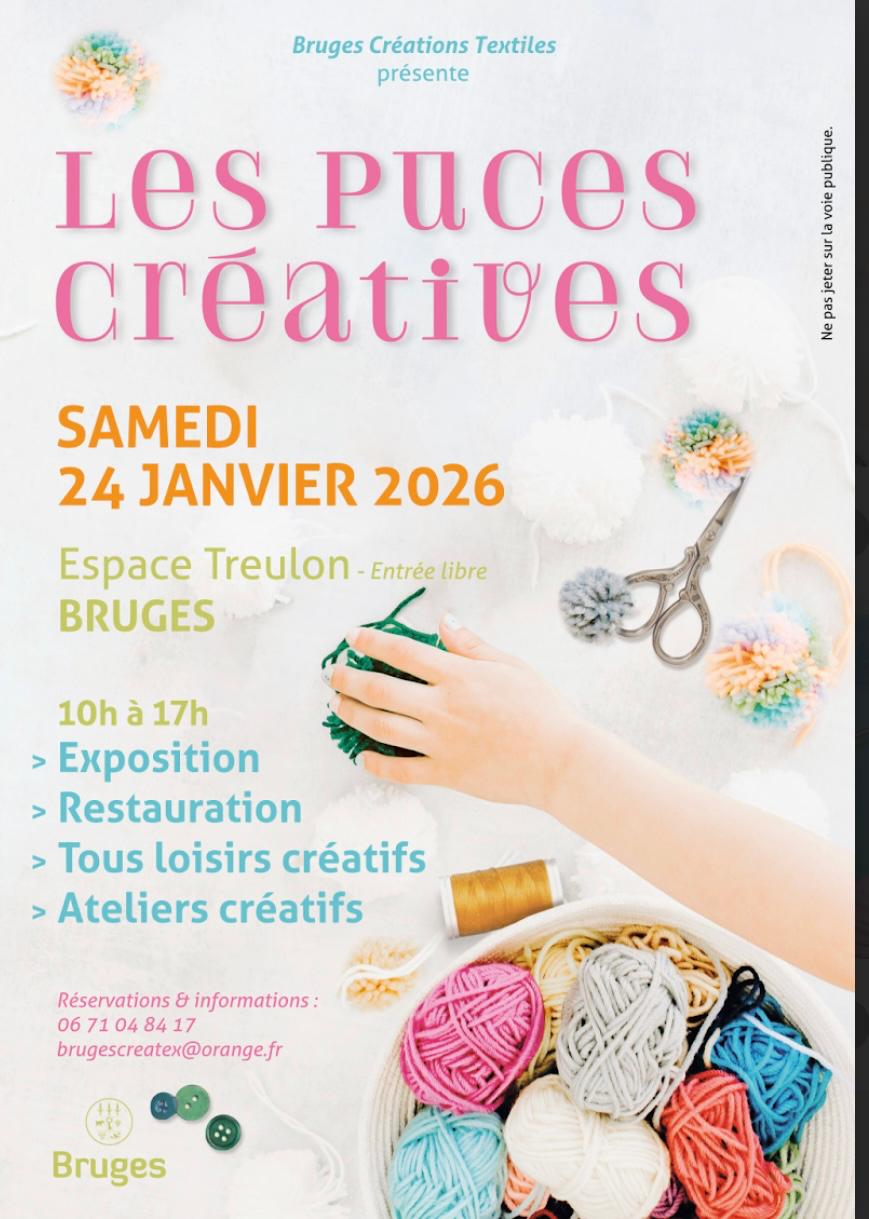 L’atelier de couture Bruges Créations Textiles et Les Tordues du Fil organisent Les Puces Créatives, un vide-atelier (vide-greniers pour les activités créatives), avec des ateliers (dont couture, dentelle au fuseau, crochet/tricot et broderie japonaise gratuits) et une exposition de nos ouvrages de l'année. Buvette à prix modique, ambiance sympa garantie.
