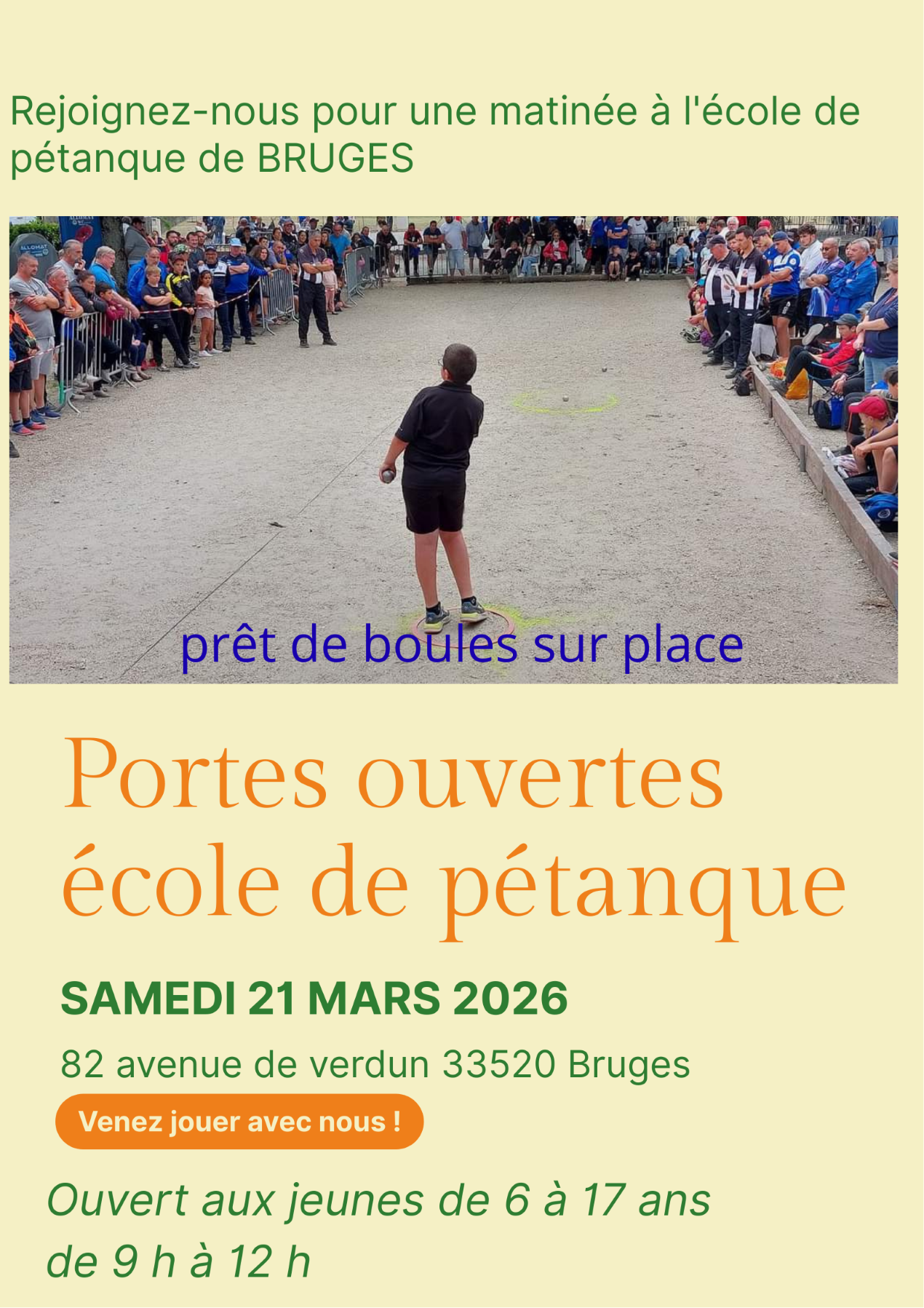L’école de pétanque de Bruges (33520) organise une matinée portes ouvertes le samedi 21 mars 2026, de 9 h à 12h, afin de faire découvrir la pratique de la pétanque aux plus jeunes.