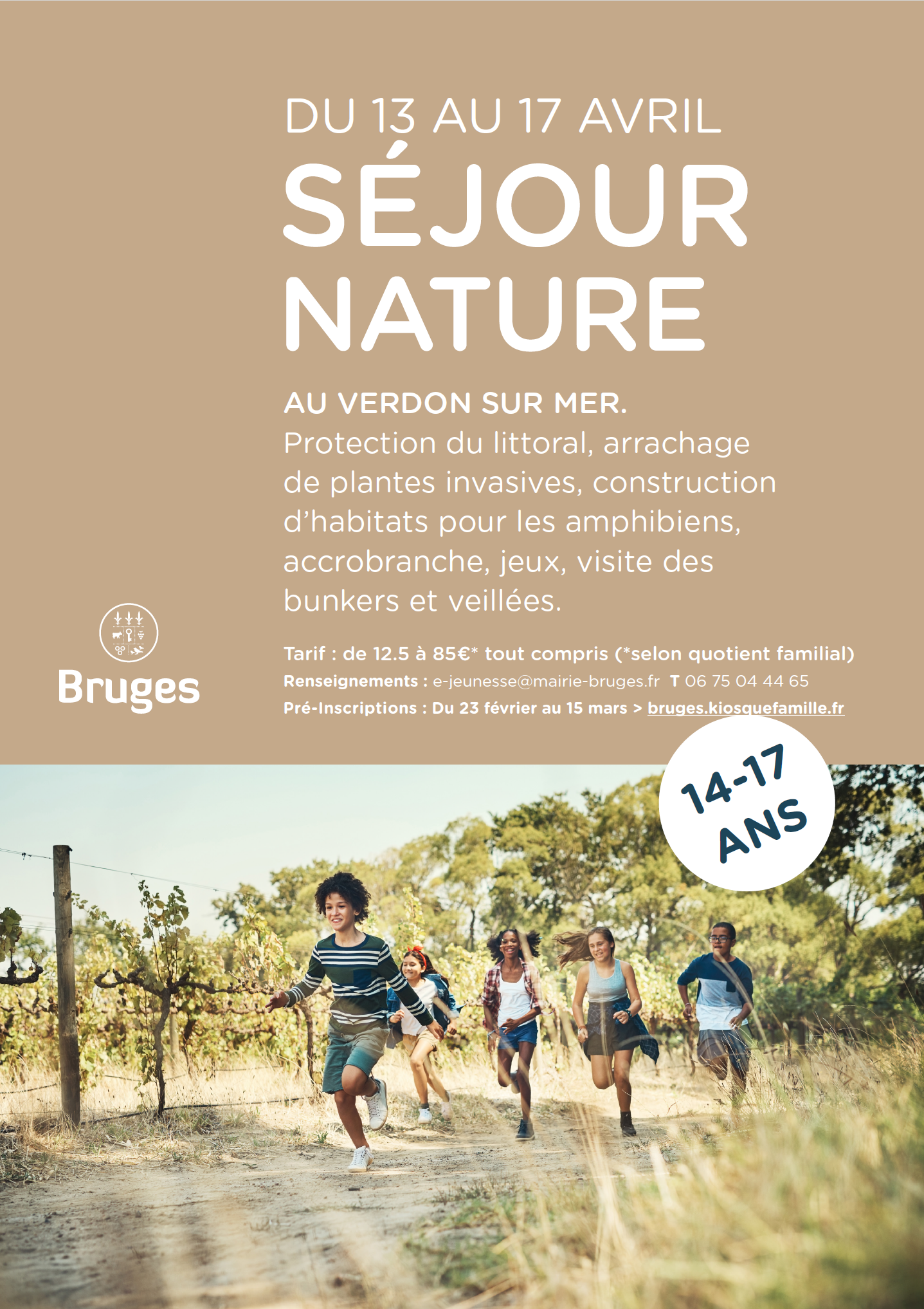 Le service sport et jeunesse de la Ville de Bruges organise un séjour nature du 13 au 17 avril 2026 en direction des 14-17 ans au Verdon sur mer.