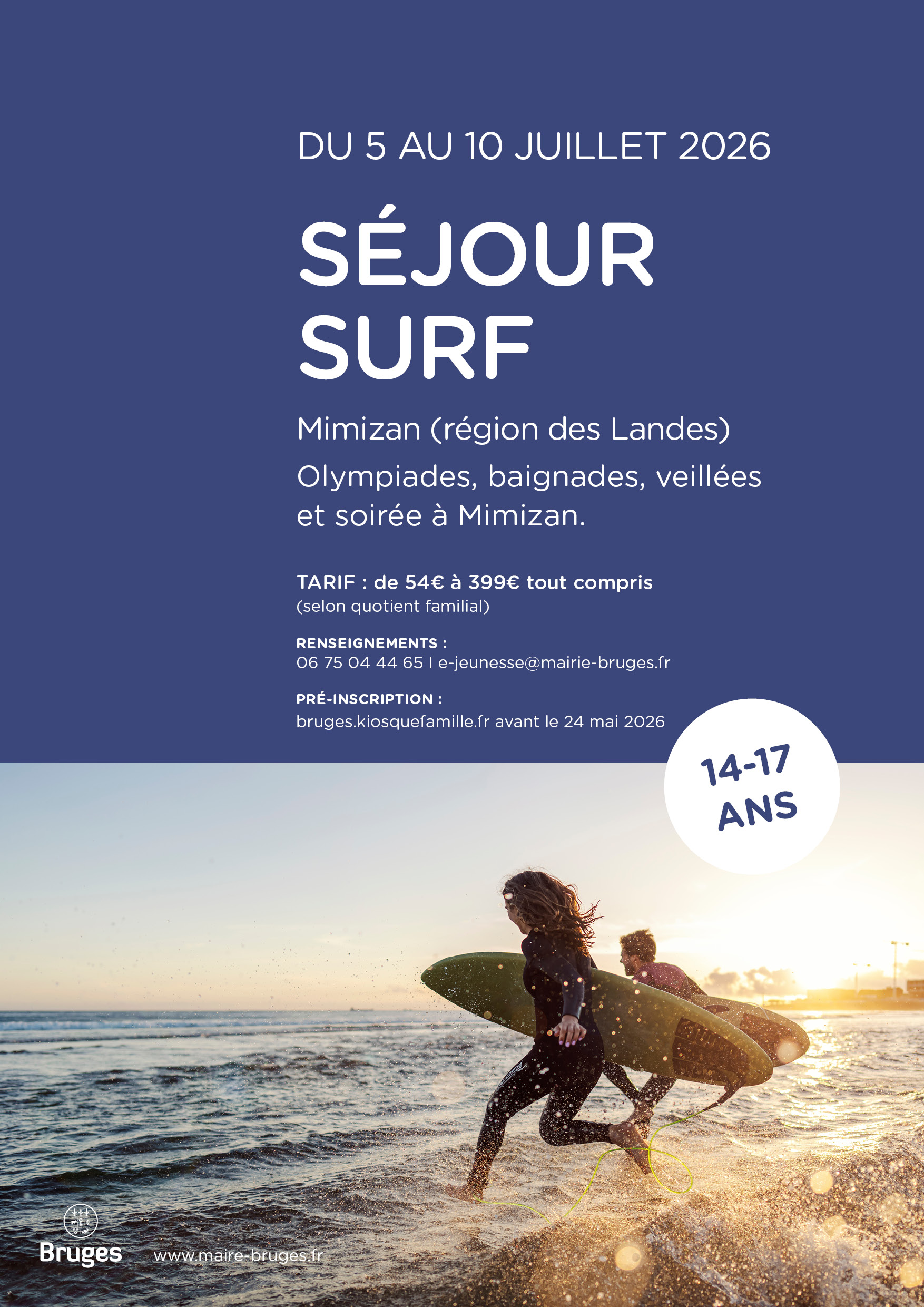 Le service sport & jeunesse de la Ville de Bruges, propose un séjour surf aux jeunes de 14 à 17 ans, dans la région des Landes (en dessous de Mimizan).