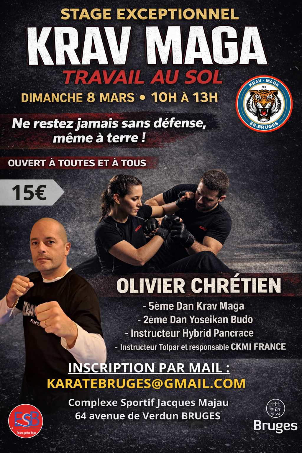Une stage de Krav Maga, animé par Olivier Chrétien (5e Dan Krav Maga) est organisé le dimanche 8 mars de 10h à 13h au complexe sportif Majau.